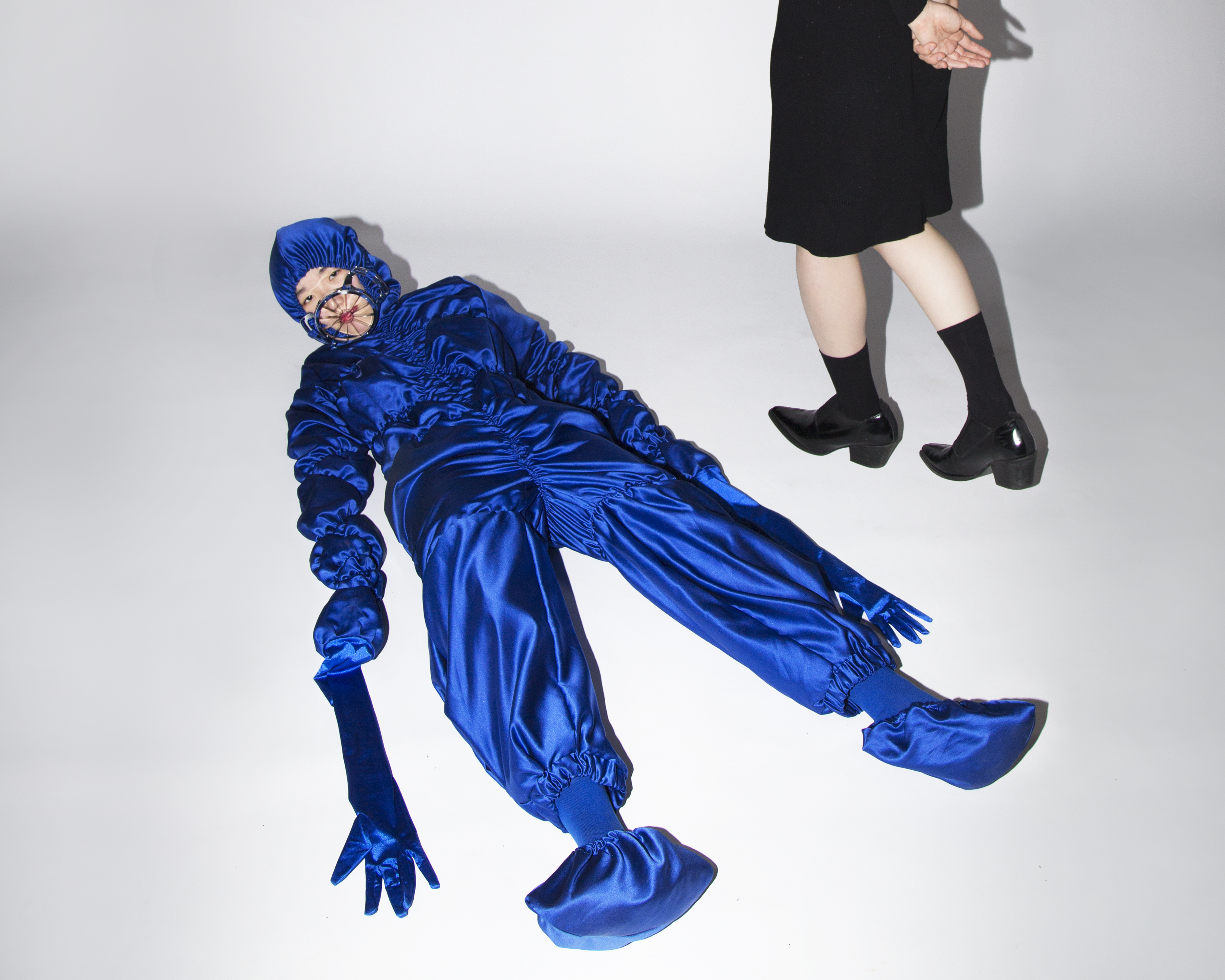 The Skin of a Human Being discusses how people fit themselves into a ready-made world—playing predetermined social characters, wearing garments designed by me for this project, and agreeing with social constructs, which brings a sense of security through certainty, but also creates restrictions. The title refers to the social skin developed by constant learning and imitating existing examples of behavior. We are living under those social skins as though living under others’ experiences.